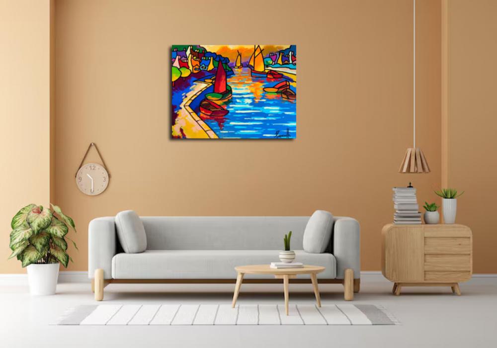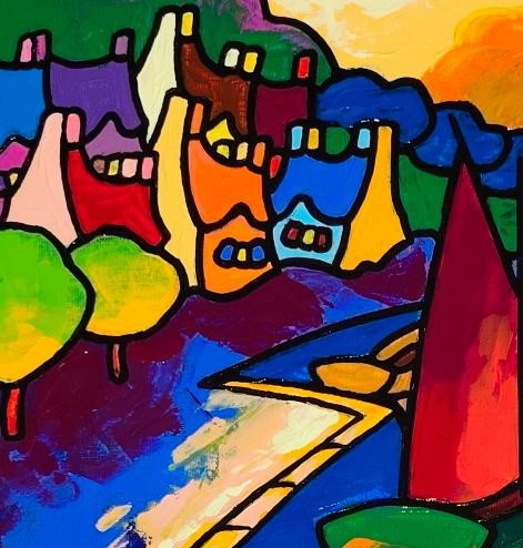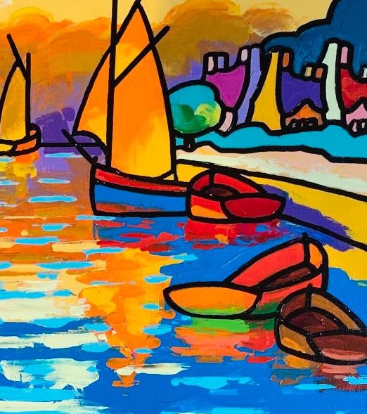 Un univers tout en couleur qui a pour fonction de détourner modifier ou amplifier… saturation des surfaces peintes jouant avec la lumière les reflets la matière. Les bateaux les maisons les personnages dansent sous son couteau.