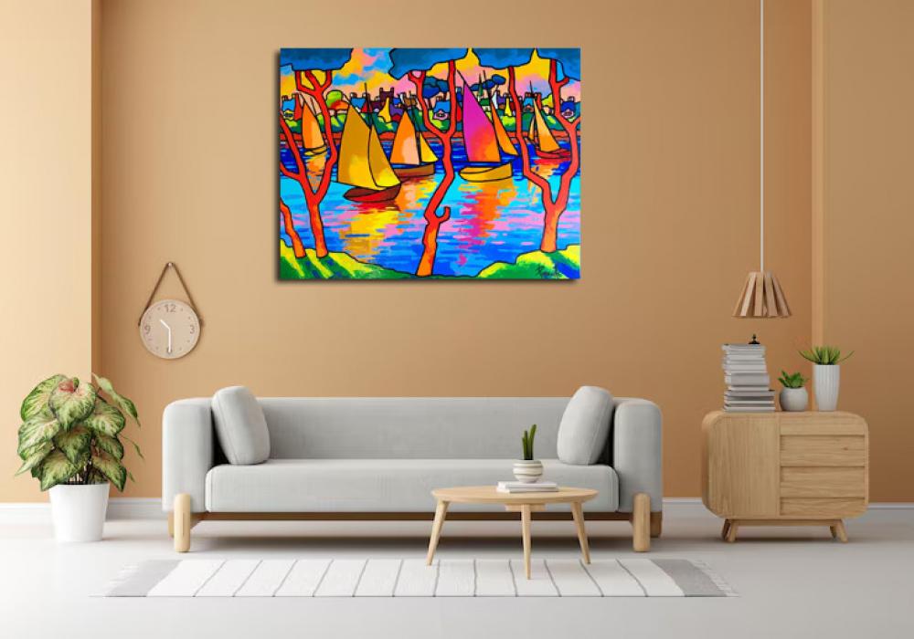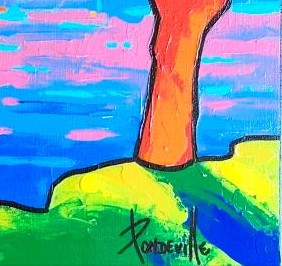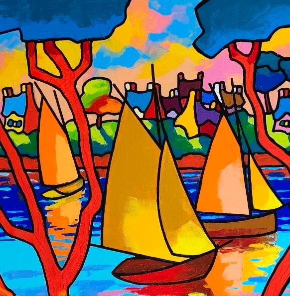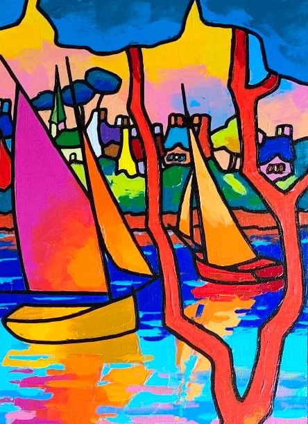 Un univers tout en couleur qui a pour fonction de détourner modifier ou amplifier… saturation des surfaces peintes jouant avec la lumière les reflets la matière. Les bateaux les maisons les personnages dansent sous son couteau.