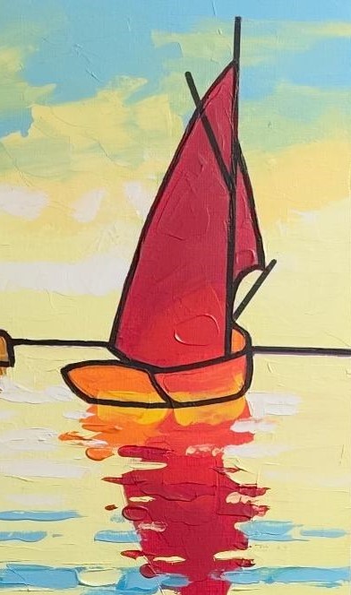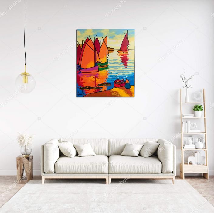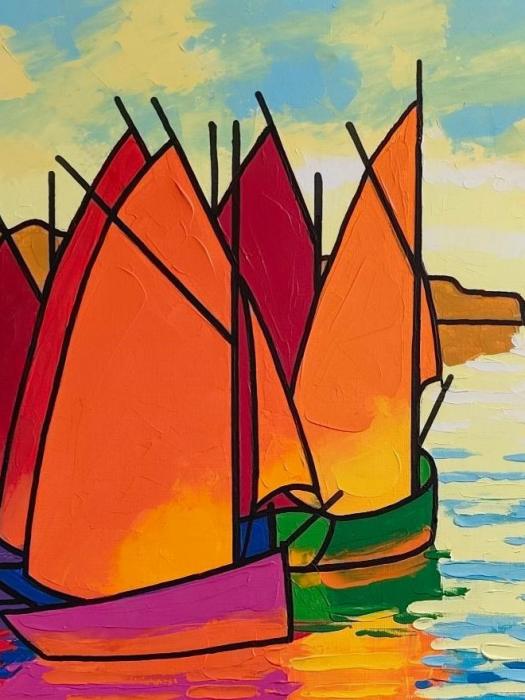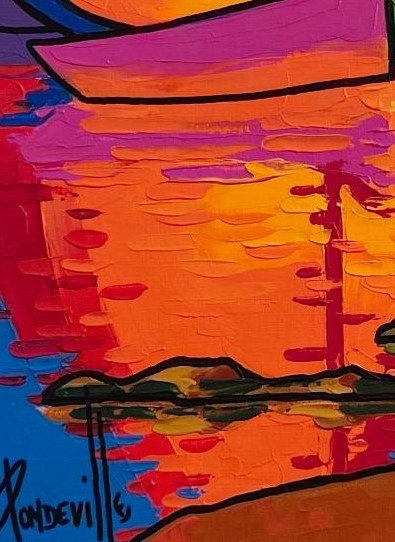 Un univers tout en couleur qui a pour fonction de détourner modifier ou amplifier… saturation des surfaces peintes jouant avec la lumière les reflets la matière. Les bateaux les maisons les personnages dansent sous son couteau.