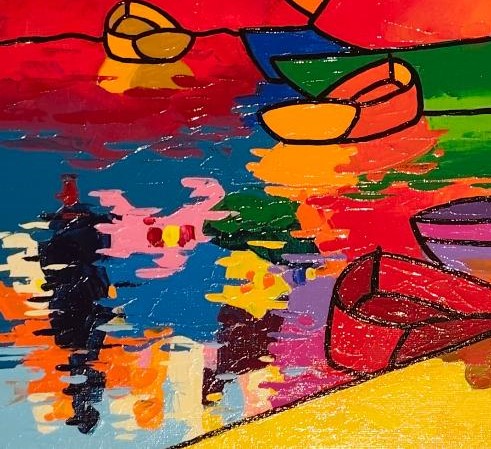 Un univers tout en couleur qui a pour fonction de détourner modifier ou amplifier… saturation des surfaces peintes jouant avec la lumière les reflets la matière. Les bateaux les maisons les personnages dansent sous son couteau.